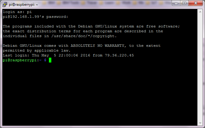 You can now use any SSH client like Putty to connect to the PI. The default user and passwords are pi/raspberry.