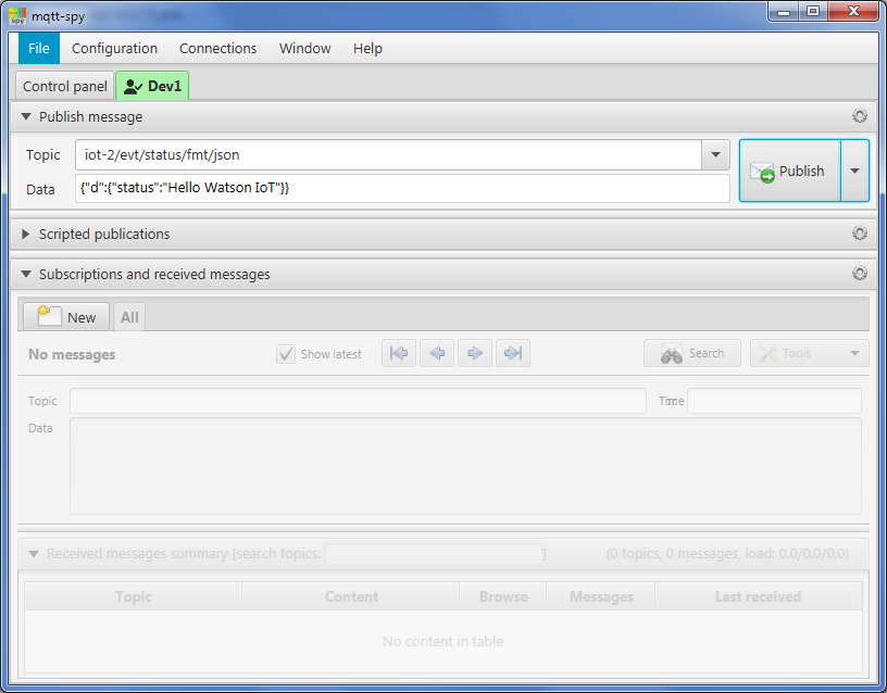 Now open the Watson IoT device details and click on the Publish button on MQTT Spy. You should see the incoming message like this.
