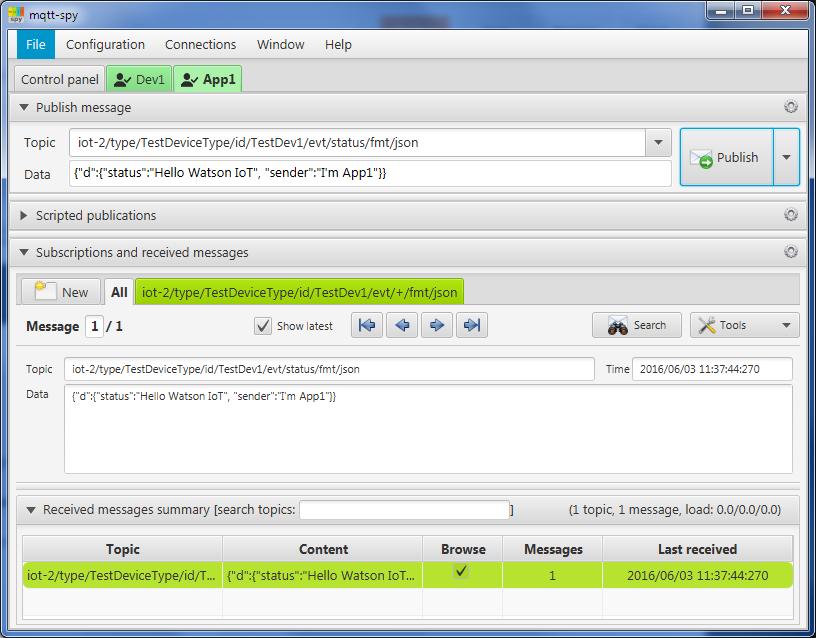 Play with MQTT Spy and see how App 1 is notified when publishing events from the device. Try changing the subscription topic as well.